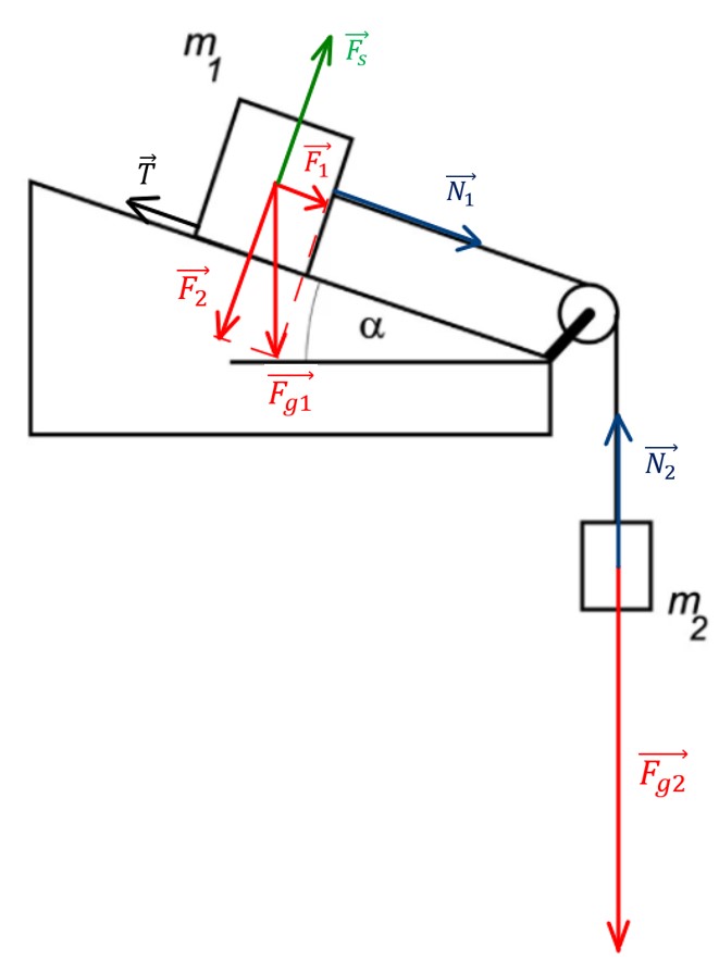 Rysunek przedstawia układ dwóch ciał połączonych nieważką i nierozciągliwą nicią. Współczynnik tarcia kinetycznego pomiędzy zsuwającym się ciałem a powierzchnią równi wynosi w tym przypadku 0.1. Masa m1 = 1 kg, m2 = 3 kg.