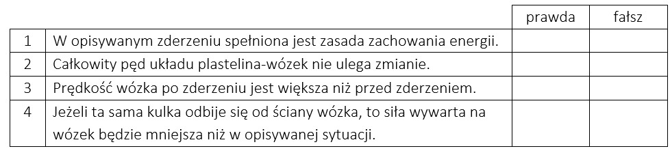 W tylną ścianę wózka o masie 100 g poruszającego się z prędkością 3 ms-1, użytego w szkolnym doświadczeniu, uderzyła kulka plasteliny o masie 20 gramów i prędkości 4 ms-1 i przykleiła się.