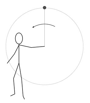 Chłopiec kręci w płaszczyźnie pionowej kamieniem o masie 100 g przywiązanym do sznurka o długości 60 cm (rysunek). Załóż, że prędkość kątowa tego ruchu jest stała.