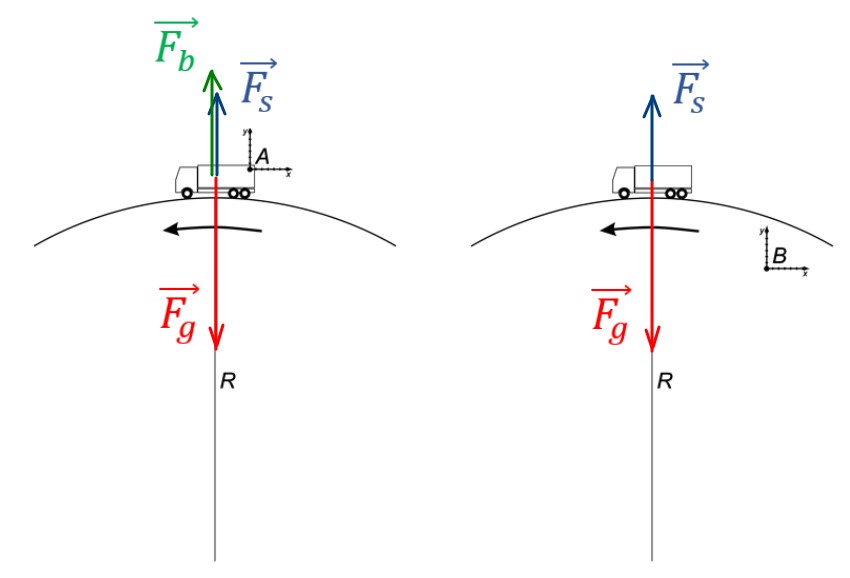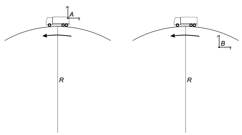 c) Przy jakiej prędkości liniowej ciężarówka oderwałaby się od podłoża w najwyższym punkcie mostu? W rozwiązaniu wykorzystaj nieinercjalny układ odniesienia.