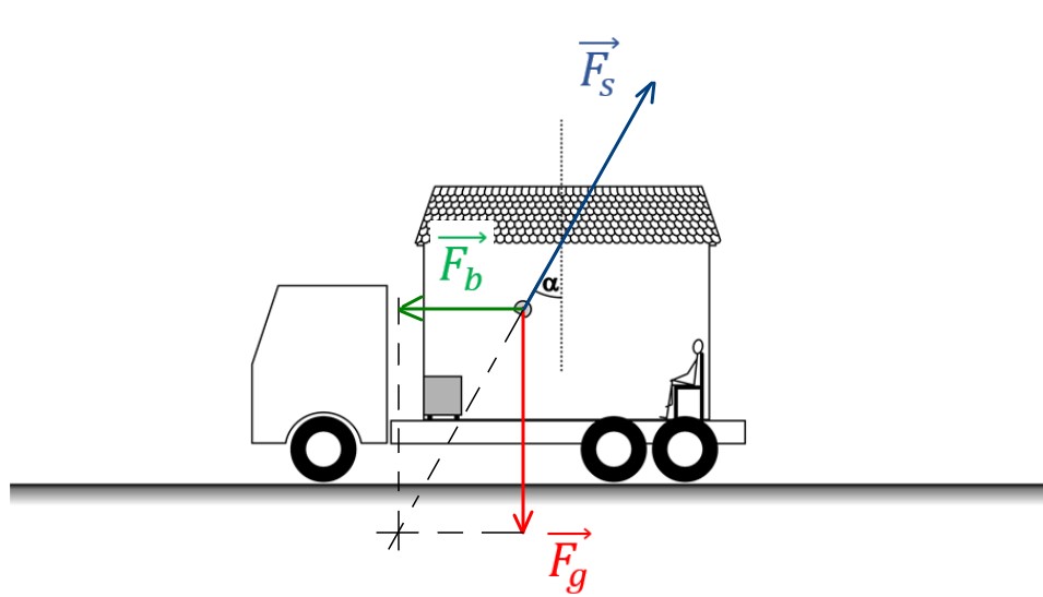 Na płaskiej, poziomej powierzchni porusza się ciężarówka transportująca domek kempingowy. Siedzący w domku człowiek zauważył w pewnym momencie, że wisząca na suficie lampa odchyliła się w kierunku ruchu o 30o od pionu i przez 5 sekund pozostała nieruchomo w takim położeniu. Przyjmij, że g = 9.8 Nkg-1.