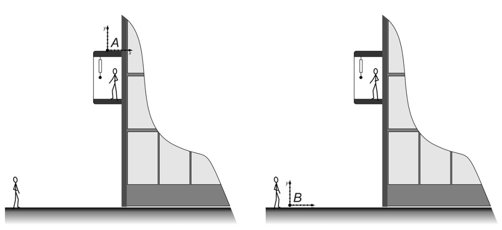 a) Narysuj siły działające na ciało w układzie odniesienia związanym z windą (A) i z ziemią (B).