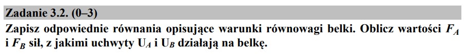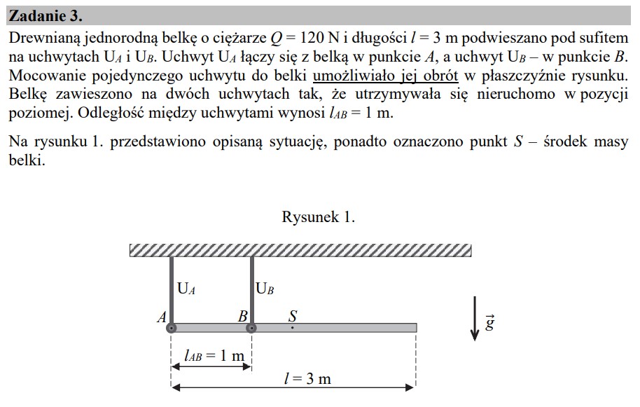 Oblicz siły nacisku, jakie wywiera belka o masie 200 kg, przedstawiona na rysunku, na punkty podparcia. Przyjmij, że g = 9.8 Nkg-1.