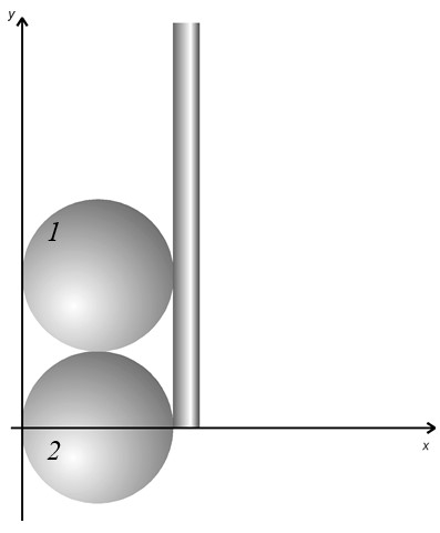 Rysunek przedstawia układ trzech brył: dwóch kul o promieniu R = 20 cm i masach M1 = 4 kg i M2 = 2 kg oraz cylindrycznego pręta o długości 94 cm, średnicy przekroju 6 cm i masie m = 6 kg.