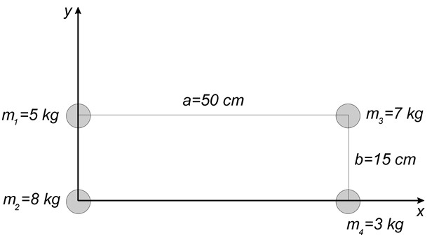Oblicz współrzędne środka masy układu punktów materialnych przedstawionego na rysunku.