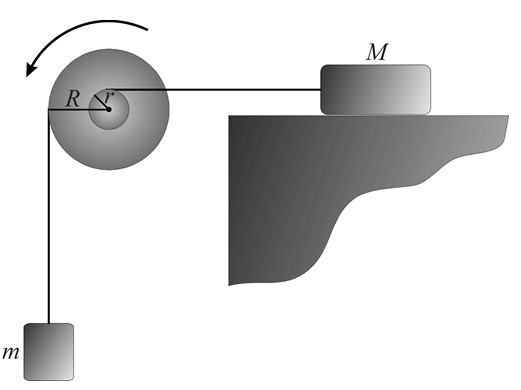 Współczynnik tarcia statycznego pomiędzy kostką o masie M = 20 kg i poziomą powierzchnią ma wartość f = 0.1. Jaką największą masę może mieć wiszący ciężarek, aby cały układ pozostał w równowadze. Tarcie na osi bloczka oraz masę sznurka zaniedbaj. Przyjmij, że R = 30 cm, a r = 10 cm.