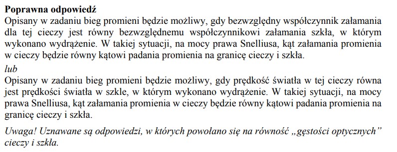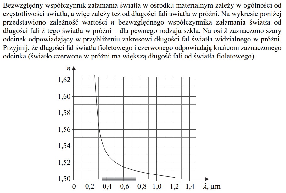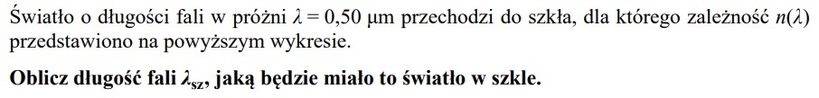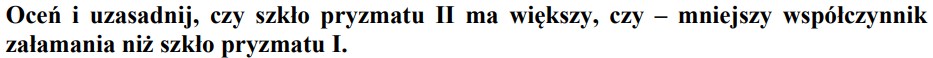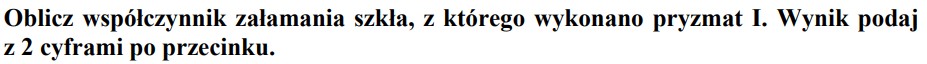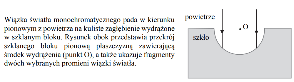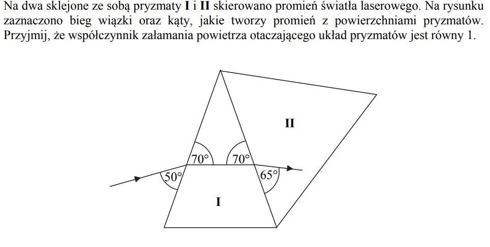 Promień światła monochromatycznego przechodzi z wody do szkła padając pod kątem 50o do powierzchni wody. Przyjmij, że bezwzględny współczynnik załamania tego szkła ma wartość 1.5.