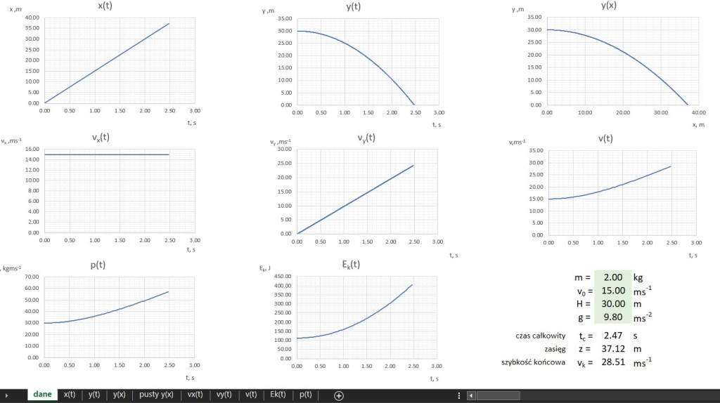 Wielką zaletą arkuszy kalkulacyjnych jest łatwość wizualizacji danych. Na lekcjach fizyki bardzo często posługujemy się wykresami różnych zależności. Jednym z istotnych założeń podstawy programowej jest opanowanie przez uczniów umiejętności analizy przedstawianej przez wykres zależności, a także wykorzystania wykresów jako źródeł danych. Wymaga to wykonania dużej ilości ćwiczeń i tu z pomocą przychodzi ponownie arkusz kalkulacyjny. Przykładem niech będzie „automat” dotyczący rzutu poziomego.
