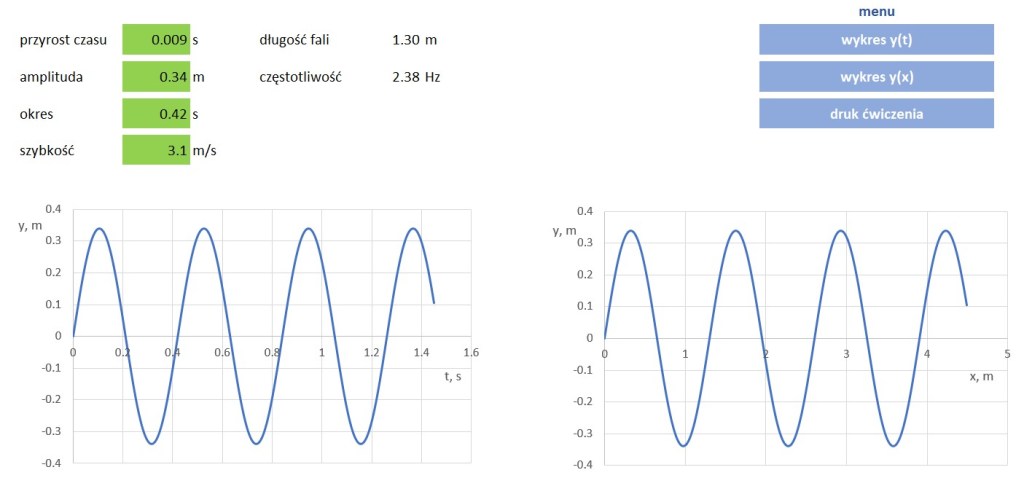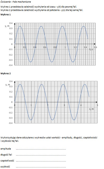 Automat nie tylko tworzy wykresy, ale również gotową kartę pracy wraz z odpowiedziami. Dzięki ćwiczeniom uczniowie utrwalą umiejętności odczytywania danych z wykresów oraz podstawowe pojęcia służące do opisu fal – amplitudę, długość fali, okres, częstotliwość i szybkość.