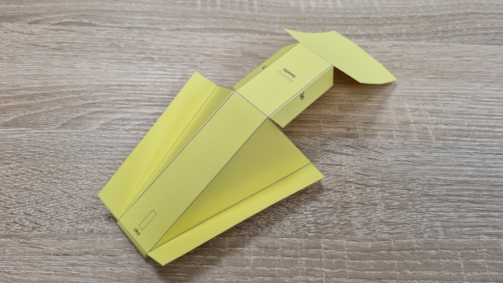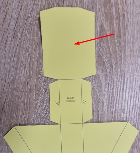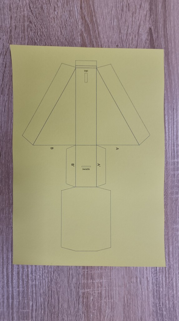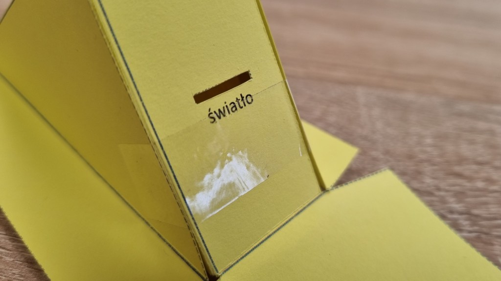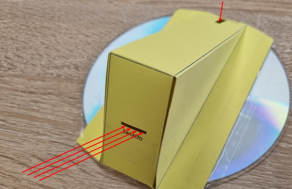 Na koniec przystępujemy do montażu przyrządu. Zaczynamy od sklejenia elementów oznaczonych literami A’ i B’. Jeśli korzystamy z taśmy klejącej, musimy jej użyć wewnątrz i na zewnątrz powstającego pudełka. Znów chodzi o to, aby do wnętrza docierało jak najmniej niepożądanego światła. Strumień światła powinien wnikać do środka tylko przez szczelinę oznaczoną „światło”.