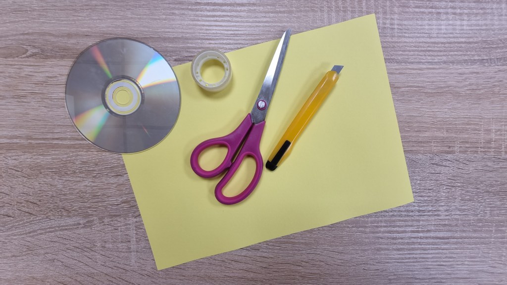 Do wykonania przyrządu potrzebne będą arkusz A4 brystolu (kartonu kreślarskiego), nożyczki, nóż introligatorski, taśma klejąca i/lub klej oraz płyta CD lub DVD, którą możemy poświęcić, ponieważ będzie jednym z głównych elementów spektroskopu.