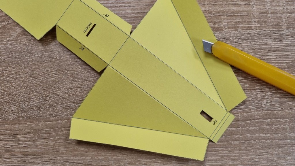 Używając noża introligatorskiego (tu chyba lepiej pomóc dzieciom ;)) wycinamy według kropkowanego konturu dwie szczeliny, opisane na szablonie: „oko” i „światło”. Ponownie ważna jest tu precyzja!