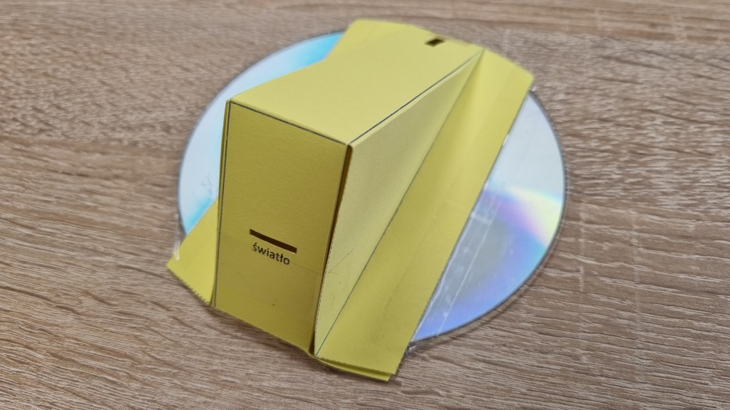 Po sklejeniu tego elementu montujemy całość na płycie CD tak, aby ścieżka płyty (strona bez napisów) znalazła się po stronie pudełka. Duży element wskazany na poniższym zdjęciu strzałką powinien znaleźć się „od spodu” płyty, czyli po stronie z napisami. Również i tutaj staramy się tak przykleić wszystkie krawędzie, aby całość była jak najszczelniejsza.