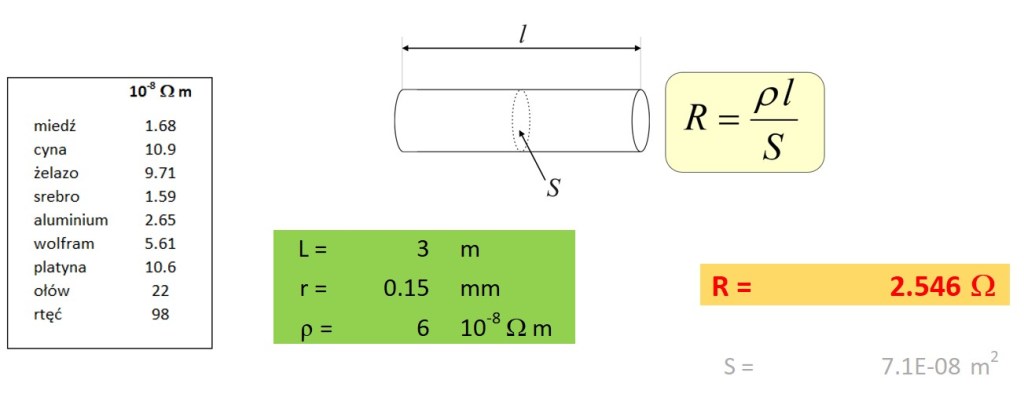 Opór przewodnika o długości l i polu przekroju poprzecznego S, wykonanego z materiału o oporze właściwym r, obliczyć można, korzystając z równania: